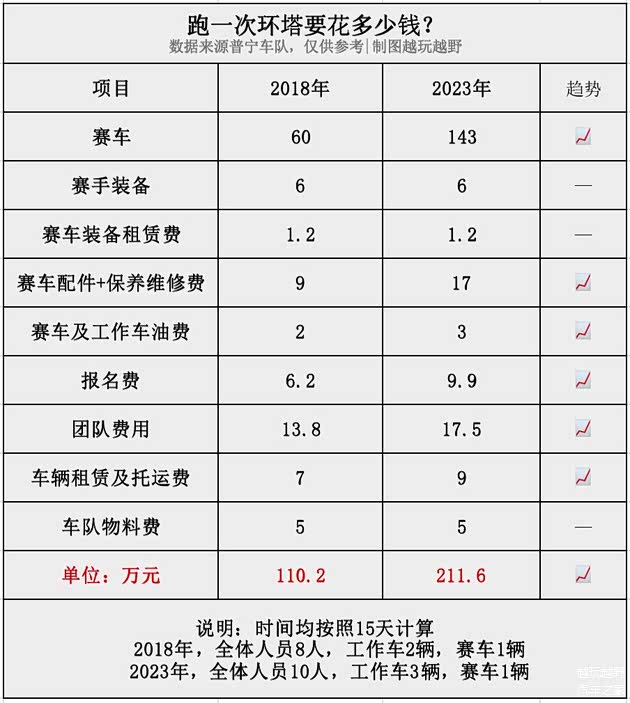 数据来源还是广东普宁车队,今年车队全体参赛成员共10人,工作车3辆,赛车1辆,参赛时间按15天计。