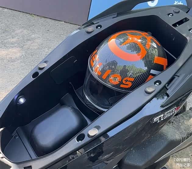 坐垫的设计师非常典型的运动踏板风格,巨大的腰靠与前后坐垫的落差,让驾驶位的舒适性得到了充分的保障。打开座桶可以看到一个感应式的LED照面灯珠,座桶的空间也非常充裕,轻松放进一定全盔,剩余空间再放一顶瓢盔加上雨衣手套等等物品不成问题。