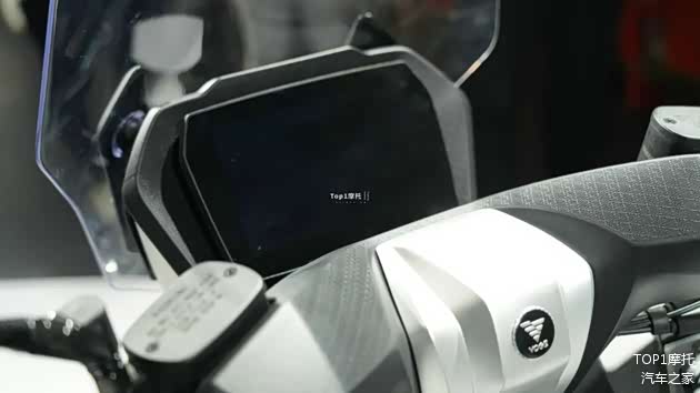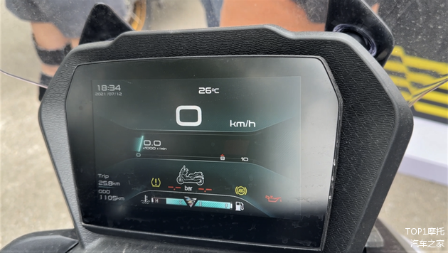 因为内场展车是没有通电的,外场的试驾车因为下雨加上扬沙,会有点脏大家凑合看一下。无极SR250GT的这块7寸的TFT仪表规格与SR4Max相当,不仅尺寸很大而且内部UI设计几乎都是一样的。像什么手机投屏,胎压显示,蓝牙连接等等功能都有配备。