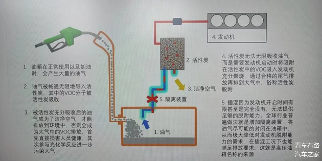 需要指出的是,纯燃油车型,虽然无法让碳罐无限量吸收油气,但发动机通过持续工作,将附在活性炭中的VOC吸入发动机充分燃烧,从而将处理达标的尾气排到大气中。