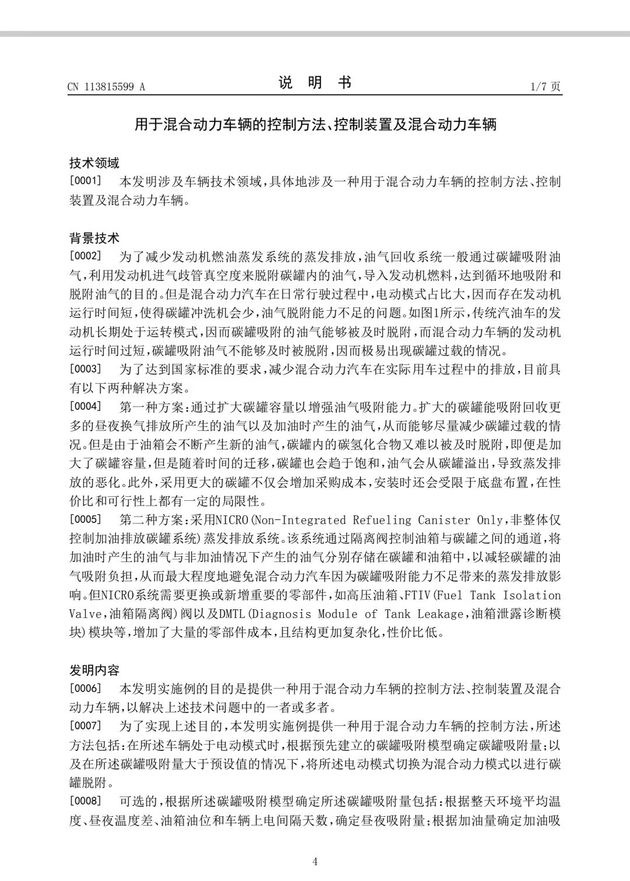 与此同时,笔者在公开专利信息来源查询到,比亚迪此前已申请名称为“用于混合动力车辆的控制方法、控制装置及混合动力车辆”的发明专利。其技术背景和发明内容显示,此专利提供一种用于混合动力车辆的控制方法、控制装置及混合动力车辆,属于车辆领域。所述用于混合动力车辆的控制方法包括:在所述车辆处于电动模式时,根据预先建立的碳罐吸附模型确定碳罐吸附量;以及在所述碳罐吸附量大于预设值的情况下,将所述电动模式切换为混合动力模式以进行碳罐脱附。