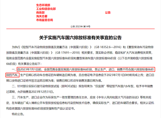 《公告》表示,自2023年7月1日起,全国范围全面实施国六排放标准6b阶段,禁止生产、进口、销售不符合国六排放标准6b阶段的汽车。