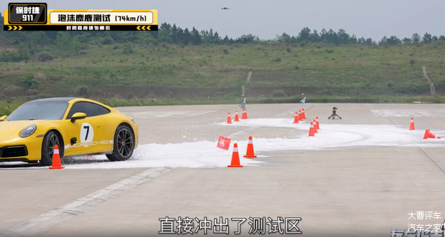 道路上喷满了泡沫洗洁精,路面非常湿滑,难度远高于普通的麋鹿测试,尤其考验车辆电子设备的配合。高合HiPhi Z与保时捷911同样以73km/h,两车均没有推头,顺利通过。但是当车速提高到74km/h时,保时捷911打滑推头,冲出测试区,挑战失败,高合HiPhi Z同样出现了打滑推头,但是ESP和后轮转向介入后,擦着桩桶通过,挑战成功。