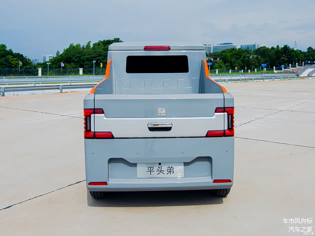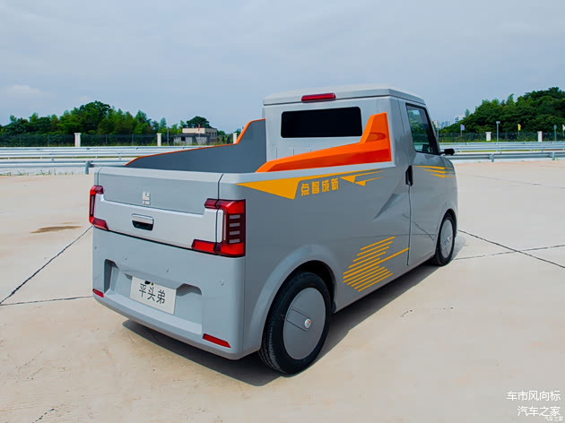 侧面的设计也挺不错,不规则形状的车门配了一块平行四边形玻璃,车轮尺寸不大,配了一个车身同色的轮毂盖,造型有点像钟表样式,车身配有橙色拉花,采用单排布局,后面全部是货斗,侧面的还增加了橙红色的装饰。