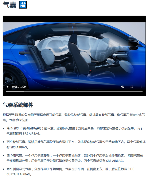 英国本田官网给出的第十一代思域用户手册上,同样也只有10个气囊,没有中央气囊。
