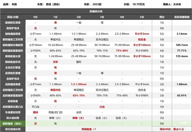 拆掉前保险杠,内部有一根与汽油版思域一致的防撞梁,都是铝合金材质。厚度为3.14毫米,汽油版的厚度为3.05毫米,两者相差不多,能覆盖车头的77.71%。