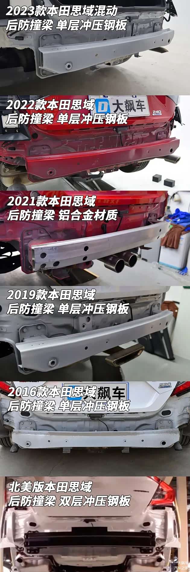 后防撞梁是一根单层冲压钢板,厚度为1.68毫米,覆盖车尾的65.91%,与同年代汽油版车型保持一致。相比老款,除了两厢思域后防撞梁是铝合金之外,其余都是单层冲压钢板,但美版思域的后防撞梁则是双层钢板。