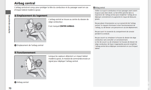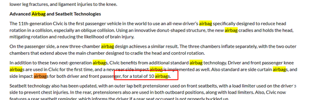 法国地区本田官网给出的第十一代思域用户手册中,明确指出,除了前排座椅两侧气囊之外,还有中央气囊。也就是说,欧盟国家销售的第十一代思域,配备了11个气囊。