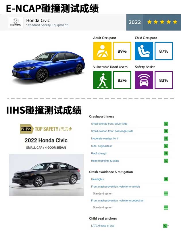 目前第十一代本田思域在美国IIHS进行过碰撞测试,取得了2022年度“安全之星Plus”的成绩,还是不错的。在欧洲E-NCAP碰撞测试中,混动思域得到了5星的好成绩。