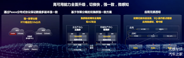 那么,华为GaussDB如何做到“无感切换”?华为云提出一套基于存算分离的“双集群强一致”的解决方案,由GaussDB数据库、数据库和应用迁移UGO、数据复制服务DRS共同组成。