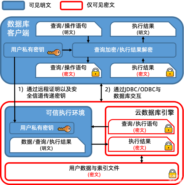 而全密态数据库支持数据端到端的加密技术,也就是从源头加密。在数据流动的整个过程中,做到数据的完全机密性,从而避免数据泄露和数据篡改的风险。全密态数据库额外对数据进行加密保护,用户掌握数据加解密密钥,加解密过程仅在客户侧完成,其他查询运算在服务端完成,从源头开始直对数据上了锁,所以数据在整个流程中都是以密文的形态存在,环节多也不怕泄露。