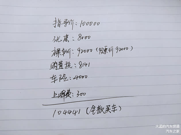 好的,大哥你看,你买的这款车指导价10万,刚好今天周末赶上我们活动,平时都是优惠6000元,今天给你优惠8000元,优惠后的裸车价92000元,发票价给你按92000元开,购置税8141元,车子保险4000元左右,上牌费300元,全款落地104441元左右。