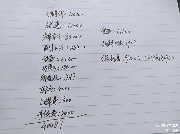 正式开始,为了清楚又详细的向大家解释这2个问题,我还是在纸上明明白白的算出来给大家看,老规矩,你是客户我是销售,请注意,我卖一辆车的提成是利润的20%。