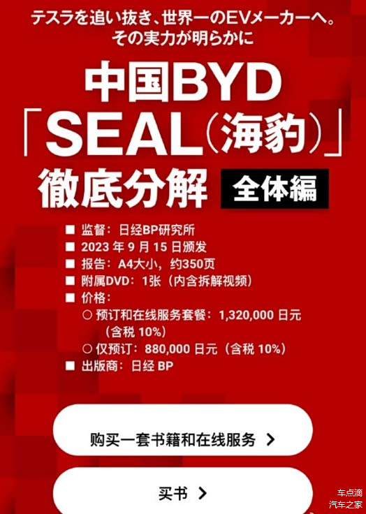 与此同时,日经BP社分析了海豹的车身架构、电池、驱动电机总成、各种控制电子器件等内容,并出版了一套面向汽车工程师群体的单价 88 万日元(4.5万人民币)的书籍,而如果同时购买在线服务,价格则高达 132 万日元(6.74 万人民币),该书籍及视频资料将在 2023 年 9 月 15 日正式发售。