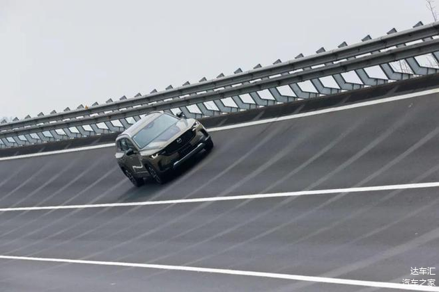 在垫江试验场内,CX-50行也首先迎接的就是最为刺激的高环挑战。在实际测试中,该项目主要是通过高速连续行驶,检测车辆在极速行驶状态下的可靠性与稳定性,再加上大倾角的道路设计,让车辆行驶时还会产生巨大的离心力,因此在连续不间断的行驶过程中,也更能体现出问题所在。
