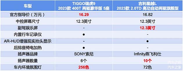 在舒适性打造方面,帝豪途虎9和吉利星越L都不遗余力,但帝豪途鹰9显然更熟练。两辆车都为驾驶员配备了电动调节装置,前排座椅配备了通风装置;加热、第二排座椅靠背调节、后排气口、前隔音玻璃、车内PM2.5过滤装置。在此基础上,TIGGO 9还为后排座椅增加了电加热功能。索尼定制的豪华音响系统和256色瀑布式音响氛围灯为用户提供了媲美豪华车型的身临其境的视听享受。周末度假时在车里与家人聊天,或者打开音响享受时光的宁静,都是不错的体验。