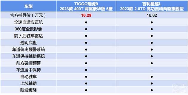 新车搭载鹏动力400T+爱信8AT或昆鹏动力400T+麦格纳国际全球最新一代7DCT湿式双离合变速箱两种动力组合,带来192kW的最大功率输出和400N的峰值扭矩。m、 可以称之为同级别的超功率输出。此外,TIGGO TIGGO 9还推出了四驱版本,配备了全场景智能四驱系统,让用户轻松应对各种出行场景,获得更多驾驶乐趣。与同样搭载2.0T发动机+7速双离合变速箱动力总成的吉利星越L相比,其最大输出功率为175千瓦,峰值扭矩为350牛米,在驾驶操控乐趣和舒适性方面已经被帝豪瑞虎9甩在了后面。
