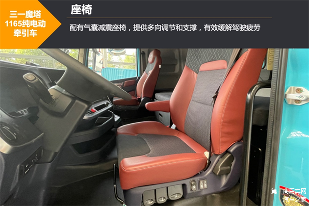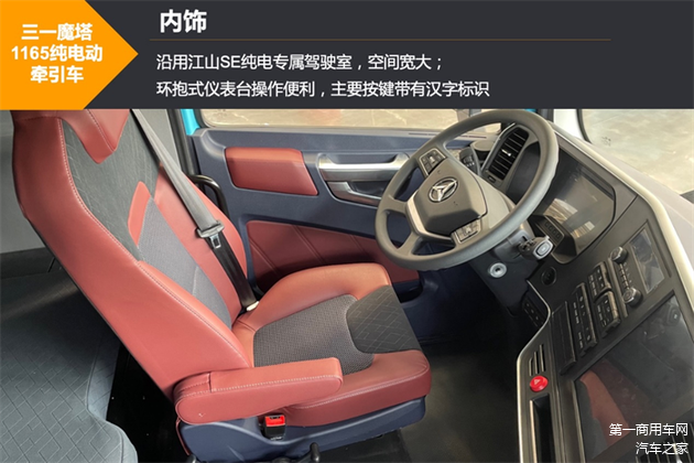 内饰方面,三一魔塔1165重卡沿用了江山SE纯电专属驾驶室,采用平地板设计,无论是驾乘空间还是卧铺都十分宽大。环绕式仪表台同样沿用了深受卡友喜爱的屏幕组合:全彩液晶仪表盘和智能网联中控大屏,配合多功能方向盘,使用起来十分便利;气囊减震座椅提供多向调节和支撑,很好地缓解了驾驶的疲劳感;采用怀挡式换挡机构,挡杆上集成了多挡能量回收、电子驻车等功能。此外,中控台上的主要按键都标有汉字,非常直观,方便用户操作。