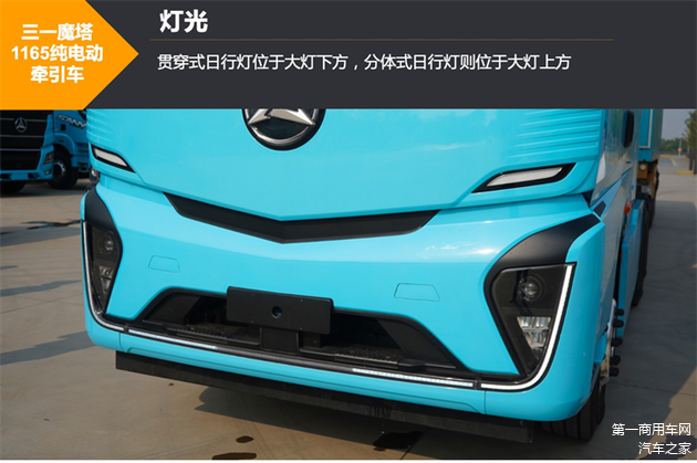 该车还采用了丰富的灯光组合,日间行车灯分为两组,其中贯穿式日行灯位于车头下方,分体式日行灯位于大灯上方,使该车拥有极高的辨识度;除了LED大灯外,车顶还带有一组高位射灯,保障了夜间的行车安全;采用发光LOGO,浅蓝色的三一车标代表着此车为新能源车型。