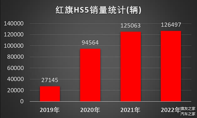 红旗品牌的销量担当-红旗HS5自2019年上市以来持续热销,在过去2019-2022四年中其年销量分别达到了27145辆、94564辆、125063辆和126497辆。可以看出红旗HS5的销量可以说是逐步攀升,渐入佳境,过去的两年都达到了月销万辆的好成绩。大家要知道这可是一辆售价20万上下的自主品牌燃油汽车,月销万辆的成绩可谓是前无古“车”,后估计也很难有来者啦。