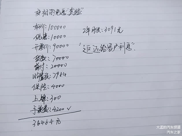 这个时候店里会这样给客户算价格,指导价10万,优惠1万,裸车价9万,贷款7万,手续费收4200元,车险4000元左右,上牌300元。