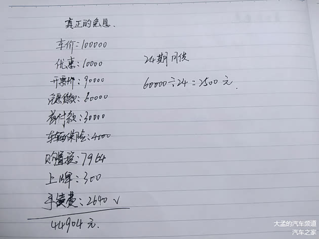 举例说明,比如你买的这台车厂商指导价10万,优惠1万,裸车价9万(开票价也是9万)免息贷款可以做6万24期,那么首付就是3万,车辆保险4000元左右,购置税9万除以11.3等于7964元,上牌300元。