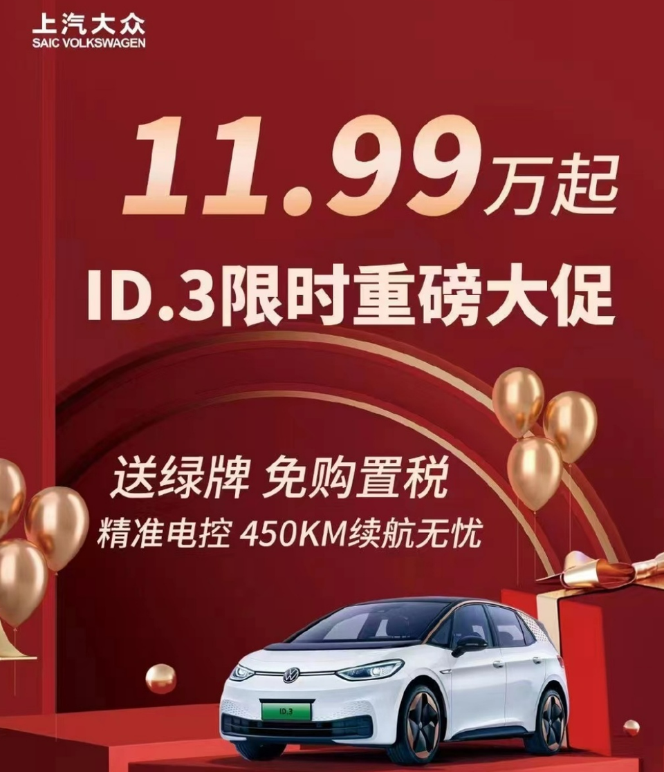 【大众ID.3限时优惠仅需11.99万起!大众多款电车集体大降价】7月6日消息,一家位于上海的“上汽大众”经销商在近日推出了巨额优惠活动,大众ID.3限时重磅大促,新车仅需11.99万元起。