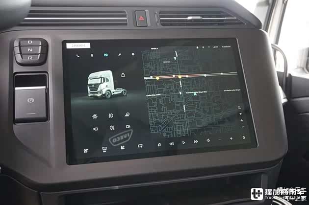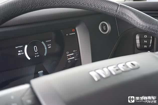 依维柯HD BEV采用了全新设计的全液晶仪表盘,以黑色为底色,辅以白色、灰色等浅色标识和字样,看起来比较简约。一键启动按钮放置在仪表盘旁,而换挡按键则位于一键启动旁。