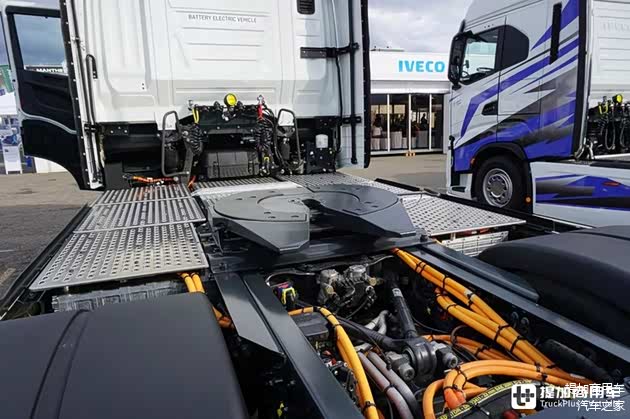 由于车辆取消了原有的内燃机及其附件,因此有了充足的空间安放电池。这台依维柯HD BEV安装了9组动力电池,总容量达到了整整738千瓦时!这也是目前欧洲电池电动卡车的最大电池容量,能为车辆带来满载500公里的续航里程。搭配350千瓦功率的直流快充系统,充至80%电量仅需90分钟。电池包上方覆盖了工作平台,可以进行踩踏。低压电路系统的电池放在了车身中部、驾驶室下方,也算挺有意思。