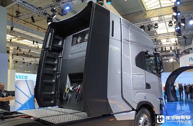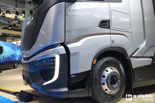 接下来,让我们来说说依维柯HD FCEV这款车。这款车基本就是尼古拉TRE FCEV的依维柯版本,除了车标不一样之外,这两款车完全一致。因此,笔者也会穿插一部分尼古拉TRE FCEV的照片为大家介绍。首先,该车的驾驶室依旧基于依维柯S-Way,但车辆采用了新设计的低风阻造型前脸,整体显得更圆滑、更外凸。