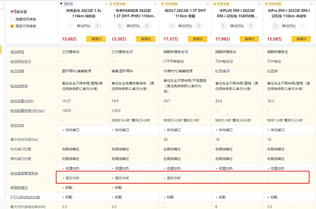 比较了一下哈弗枭龙 2023款 1.5L 110km 领航版、 哈弗H6新能源 2022款 1.5T DHT-PHEV 110km 畅行版、银河L7 2023款 1.5T DHT 115km 星舰、宋PLUS DM-i 2023款 DM-i 冠军版 150KM旗舰PLUS 、宋Pro DM-i 2023款 DM-i 冠军版 110km 卓越型这5款车型的热管理系统,其中哈弗和吉利的车有液态冷却,比亚迪的车没有这一块。