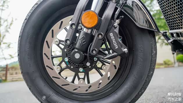 刹车配置方面,采用了前单碟对向四活塞卡钳,后对向双活塞卡钳,品牌贴标BENDA,实际制动力表现欢迎跟进后续动态测试,标配双通道ABS,刹车规格在这个级别里是常规水准。