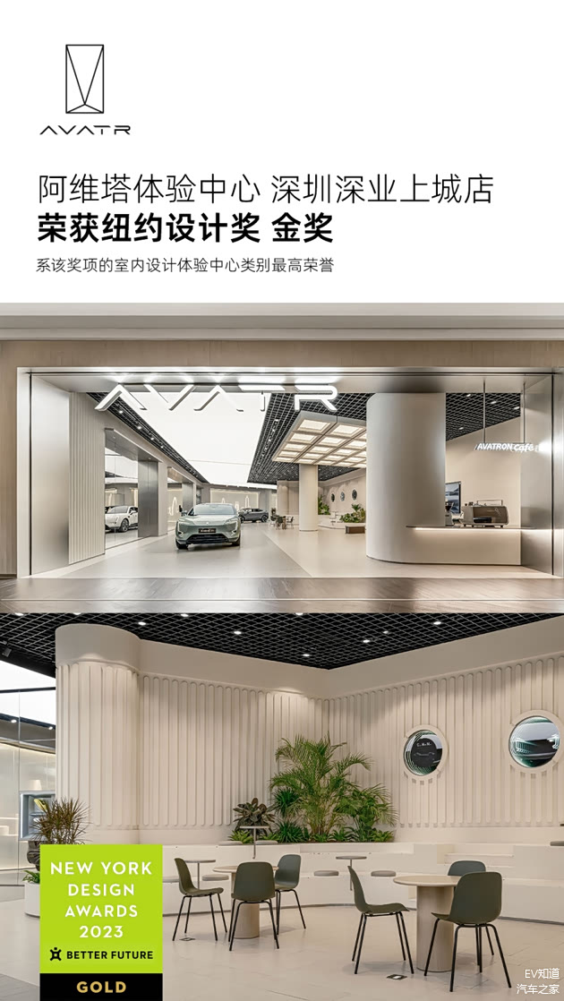 2023年10月24日,阿维塔体验中心日前连续摘得纽约设计奖金奖、INT室内设计奖年度最佳商业设计奖两项权威设计大奖。其中,纽约设计奖是全球知名的权威设计大奖之一,评审团由全球顶尖设计师组成,阿维塔体验中心-深圳深业上城店获得室内设计体验中心类别金奖,系该奖项的最高荣誉。