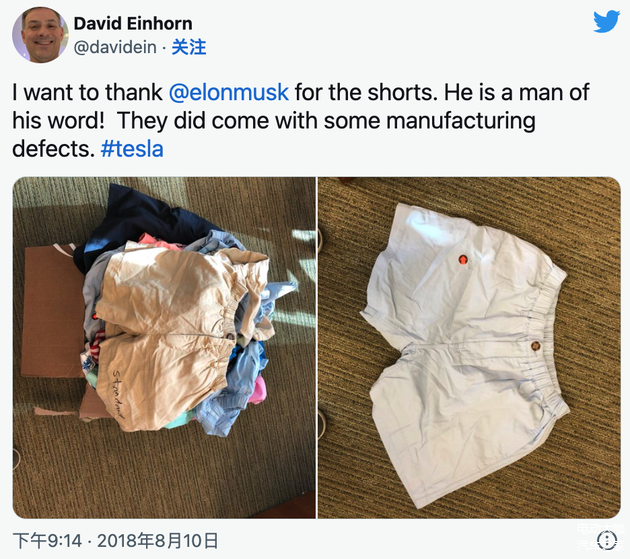 马斯克自然不会放过这样一个嘲讽对手的好机会:他给大卫·埃因霍温快递了一箱短裤。第二天,大卫·埃因霍温在twitter上晒出了照片:“短裤已收到,但貌似质量一般。”