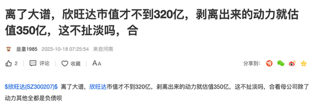 有股民表示,“离了大谱,欣旺达市值才不到320亿,剥离出来的动力就估值350亿,这不扯淡吗,合着母公司除了动力其他全都是负债呗。”“300亿的公司,拆出来估值300多亿,中信全程辅导上市,厉害厉害。零元购一条龙。”