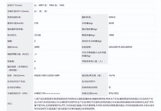 在外观方面,小米首款新车的单电机版本尺寸为4997/1963/1455mm,轴距为3000mm,总质量为2430kg。接近角和离去角分别为14度和16度。而双电机版本的新车尺寸为4997/1963/1440mm,轴距为3000mm,总质量为2655kg。接近角和离去角分别为13度和16度。