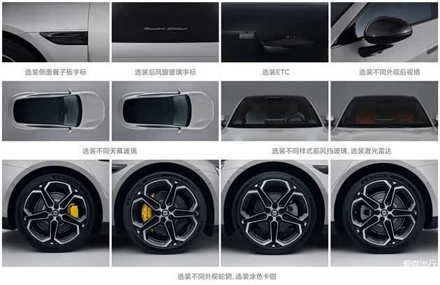 该车可选装的配置包括侧面翼子板字标、后风窗玻璃字标、ETC(电子不停车收费系统)、不同外观后视镜、不同天幕玻璃、不同样式前风挡玻璃以及激光雷达。此外,尾标也提供多种选择,可选“SU7 Max”、“SU7 Pro”以及“北京小米”、“Xiaomi”。这些可选配置提供了车主在外观和功能方面的一系列个性化选择。