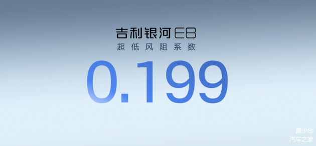 造型,除了美观之外,更重要的功能是降低风阻,以获得更低的油/电耗。银河E8拥有目前量产车最低的风阻系数——0.199Cd,远低于同级的标杆车型比亚迪汉EV 0.233Cd的风阻系数。