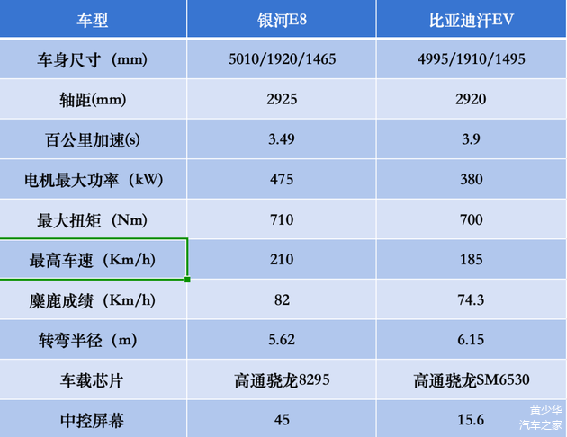 在性能方面,银河E8将提供单、双电机两种版本,其中单电机版本最大功率为200kW,四驱双电机版本综合功率达475kW,最快零百加速仅为3.49秒,低于比亚迪汉EV最快的3.9秒。