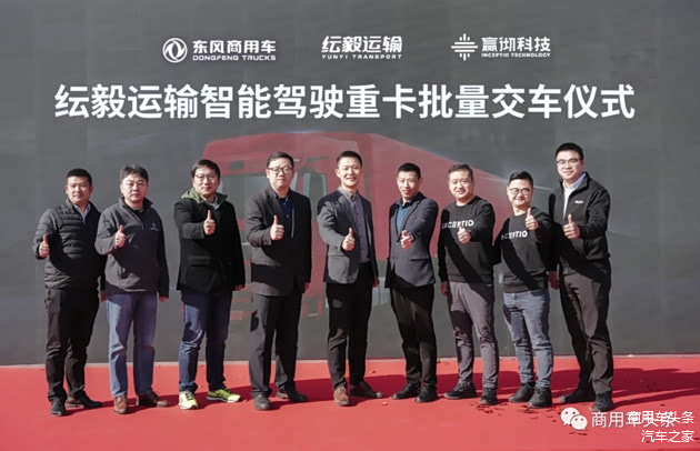 11月24日,东风商用车携手嬴彻科技为纭毅运输定制开发的智能驾驶重卡在扬州完成首批交付。东风商用车营销公司副总经理王冀,嬴彻科技执行副总裁阿玉顺、销售副总裁詹亮飞,纭毅运输运营负责人马昌伟、车辆管理负责人杨东宝等领导出席活动。作为迄今为止行业最大批量的单次智能重卡交付,活动受到多方关注。在三方签订的300台智能驾驶重卡批量采购中,首批63台东风天龙智能重卡交付后,即将正式投入全国干线货运线路,为纭毅运输开启常态化的智能驾驶运输服务。