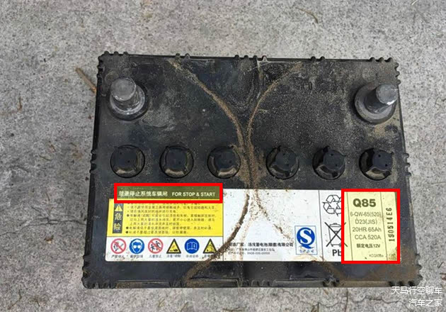我用给我的 马自达昂克赛拉换电池的案例给大家分享,相信大家可以get到一些“无用“的新知识。蓄电池种类繁多,首先要认识蓄电池上的参数,大家看下面这个图,是我昂克赛拉换下来的原电池,左边写的是“怠速停止系统车辆用”,说明这是启停系统专用电池。右边Q85是型号,6-QW-65中6代表6个单体电池,每个电池是2V,6就代表12V,QW代表着启动型和免维护型“启”和“维”的首字母,数字65代表电瓶容量65Ah,后面还有一个CCA520A,代表冷启动电流520A,这几个参数为重要参数。