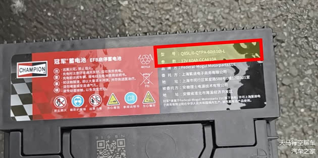 而我选择的替代品是冠军蓄电池,首先看冷启动电流,这是最关键的指标,直接决定了电池能否替代原厂电池,我建议新电池CCA至少要和原厂买数字一样的,或者更大一些,不然就有可能会“带不动”起动机,日常驾驶也许没问题,可冬天就有风险。我挑的冠军蓄电池CCA是610A,大于原厂的520A,可见在冷启动下性能更好,极端工况的适应性更强。其次要看电池容量,我这个为60Ah,略低于原厂65Ah,一般和原厂相差+10Ah问题不大。理论上容量越大,电池的使用寿命越长,可靠性越高。电池容量过小,容易造成蓄电池亏电、起动困难等问题。而QTPA是启动用干荷电式蓄电池,也是启停电池的一种,匹配性没有问题。