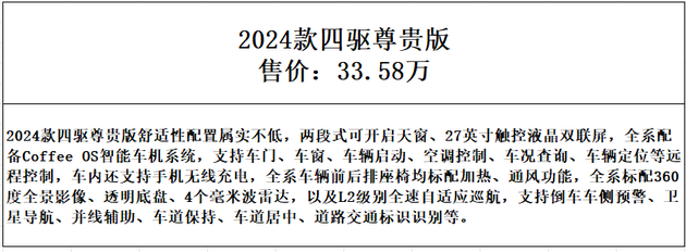 2024款四驱尊贵版舒适性配置属实不低,两段式可开启天窗、27英寸触控液晶双联屏,全系配备Coffee OS智能车机系统,支持车门、车窗、车辆启动、空调控制、车况查询、车辆定位等远程控制,车内还支持手机无线充电,全系车辆前后排座椅均标配加热、通风功能,安全配置方面同样信息十足,标配主副驾驶位安全气囊、前排侧气囊、前后排头部安全气帘等,车道偏离预警系统,主动刹车安全系统,前、后方碰撞预警,防侧翻系统,最为值得注意的是,魏牌高山全系标配360度全景影像、透明底盘、4个毫米波雷达,以及L2级别全速自适应巡航,支持倒车车侧预警、卫星导航、并线辅助、车道保持、车道居中、道路交通标识识别等。