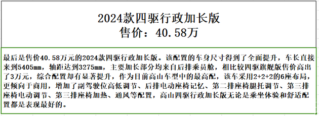 最后是售价40.58万元的2024款四驱行政加长版。该配置的车身尺寸得到了全面提升,车长直接来到5405mm,轴距达到3275mm,主要加长部分均来自后排乘员舱,相比较四驱旗舰版售价高出了3万元,综合配置却有显著提升,增加了疲劳驾驶提示、内置行车记录仪、全车6摄像头、手势控制、面部识别、六区域语音分区唤醒,作为目前高山车型中的最高配,该车采用2+2+2的6座布局,更倾向于商用,增加了副驾驶位高低调节、后排电动座椅记忆、第二排座椅腿托调节、第三排座椅电动调节、第三排座椅加热、通风等配置,高山四驱行政加长版无论是乘坐体验和舒适配置都是表现最好的,消费者可按需选择;就配置来看高山的竞对主要是腾势D9,它们的定位与售价基本重叠,车型划分与配置也都相差不大,该有的舒适性配置谁都不少。相比之下,高山主要的优势在于拥有普通版和加长版两种车型,无疑给消费者更多的选择空间。