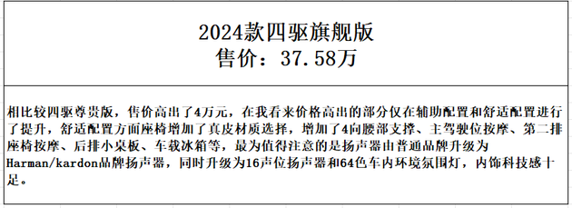 相比较四驱尊贵版,售价高出了4万元,在我看来价格高出的部分仅在辅助配置和舒适配置进行了提升,驾驶配置方面增加了自动泊车、遥控泊车、感应后备厢、蓝牙钥匙、HUD抬头显示等,舒适配置方面座椅增加了真皮材质选择,增加了4向腰部支撑、主驾驶位按摩、第二排座椅按摩、后排小桌板、车载冰箱等,最为值得注意的是扬声器由普通品牌升级为Harman/kardon品牌扬声器,同时升级为16声位扬声器和64色车内环境氛围灯,内饰科技感十足。