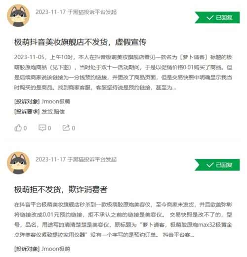 《港湾商业观察》注意到,截至11月28日,在黑猫投诉平台,搜索关键词“极萌”有214条投诉,搜索“Jmoon极萌”累计有投诉量67条,近三十天投诉量25条,已完成7条。消费者投诉问题主要集中在美容仪烫伤、不保价、质量问题、降价严重、与宣传不符、不履行活动规则、少发赠品等。无论从购买、使用还是售后的角度看,消费者都曾对购买极萌产品的体验表示了不满。