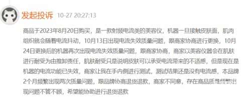 10月27日,有消费者表示,自己于8月份购买的美容仪在10月中旬出现电流失效的质量问题,在与商家协商进行更换后,10月24日,更换后的机器再次出现电流失效的问题。再第二次因质量问题与商家沟通时,商家以美容仪器会对肌肤进行耐受为由进行推卸责任。对于两个月内频繁出现两次质量问题,并且沟通无果的情况,该名消费者要求退货退款。