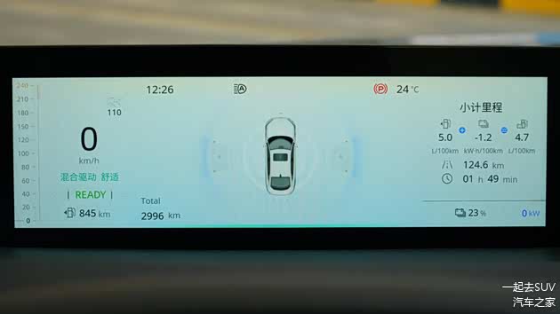 高速亏电油耗测试共行驶124.6km,车辆剩余电量从18%增长到23%,表显燃油消耗5.0L/100km,加注燃油6.01L,实测油耗4.82L/100km。