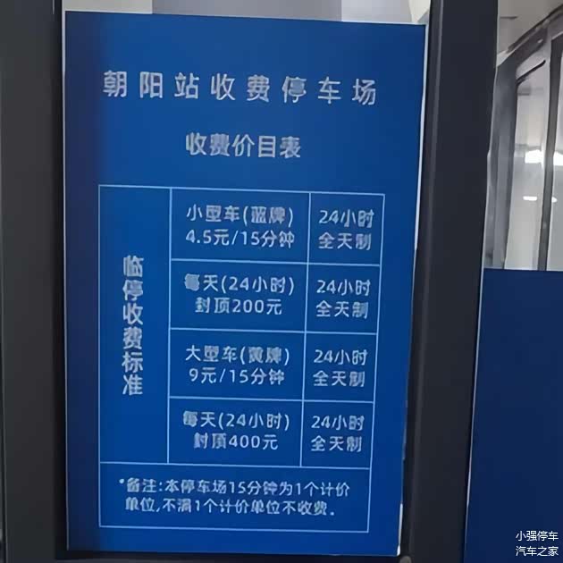 北京朝阳站设有收费停车场,针对不同车辆类型,制定了不同的收费标准。