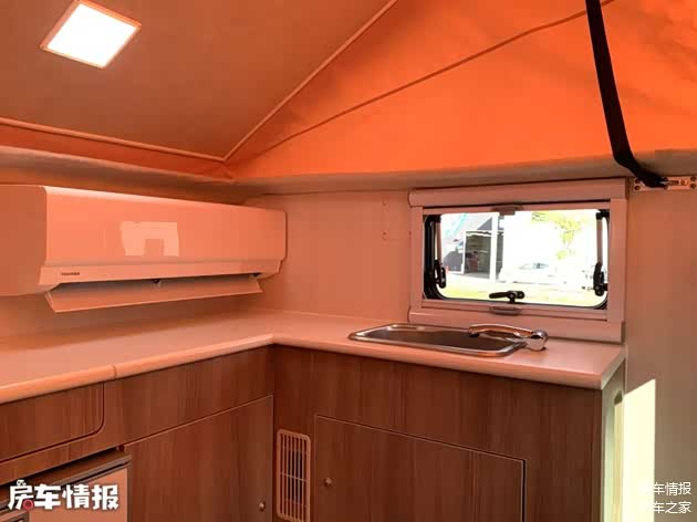 卡座后方是简易的厨房区域,做了一个L型的操作台,虽然面积不大但是活动空间还是比较充足的,驻车之后还可以作为置物台使用;操作台上配备了一个洗手池,日常用水还是比较方便的;上方加装了一台空调,驻车后可以调节车内温度,保证舒适度。